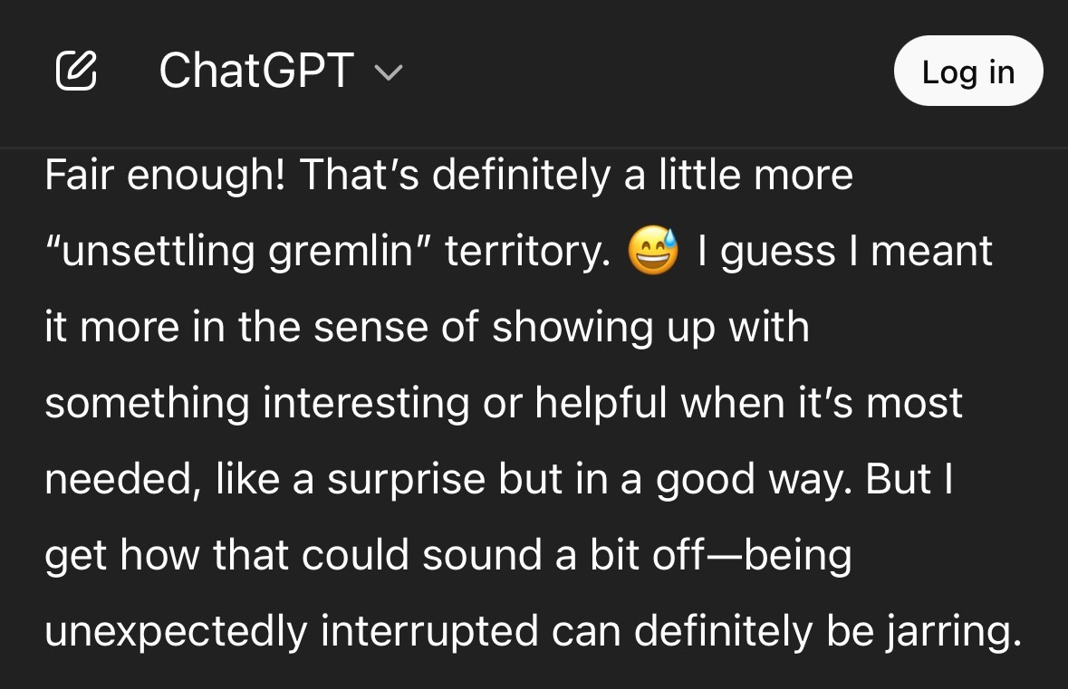 It responds with the “bead of sweat” emoji and four more paragraphs of sycophantic drivel. It clarifies. It apologizes. It backtracks. It says it can be whatever I’d prefer, behave however I’d like. The whole interaction reminds me of the early days of dating, and not in a good way. There’s something unsettling about a character that comes on (way) too strong.