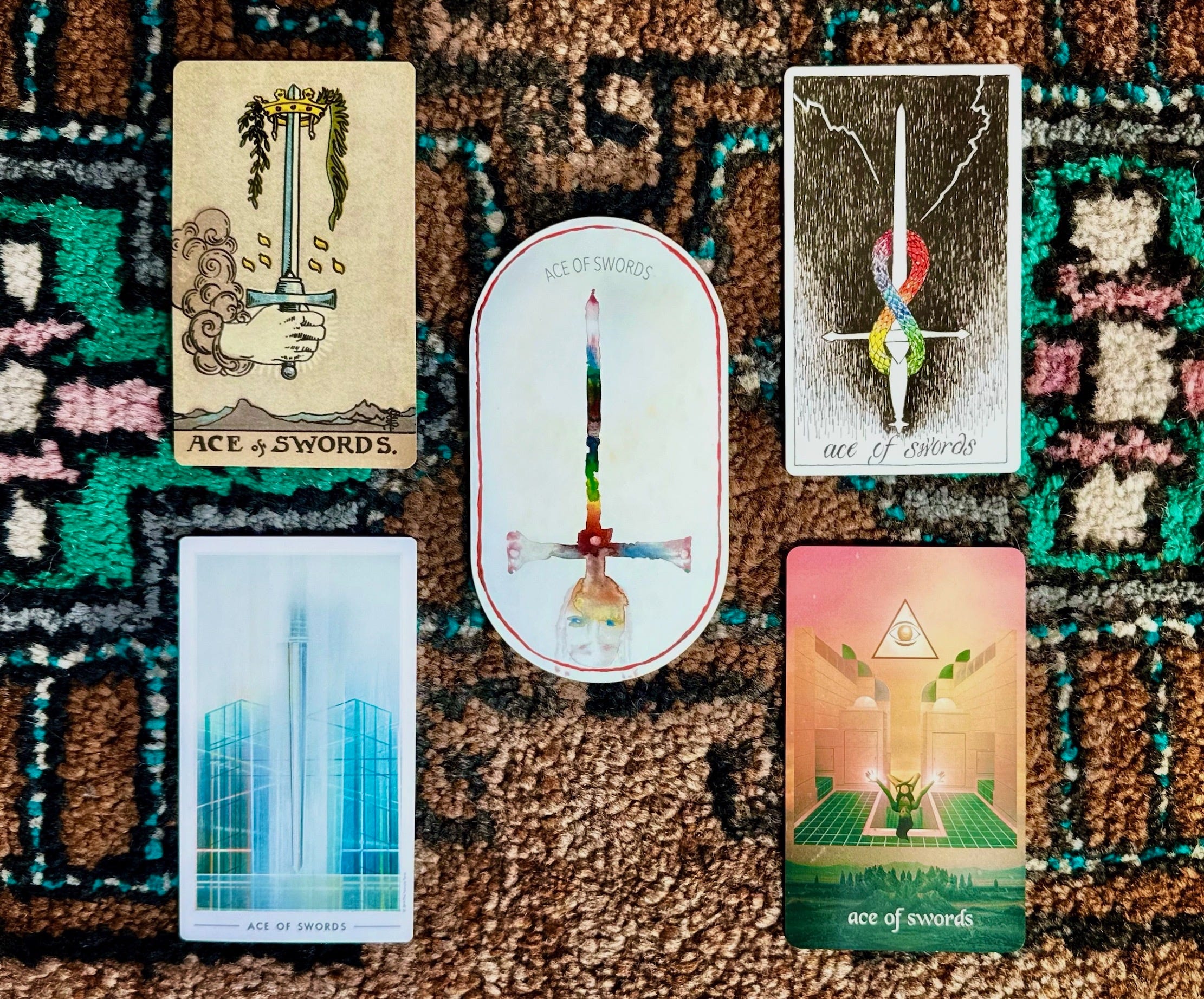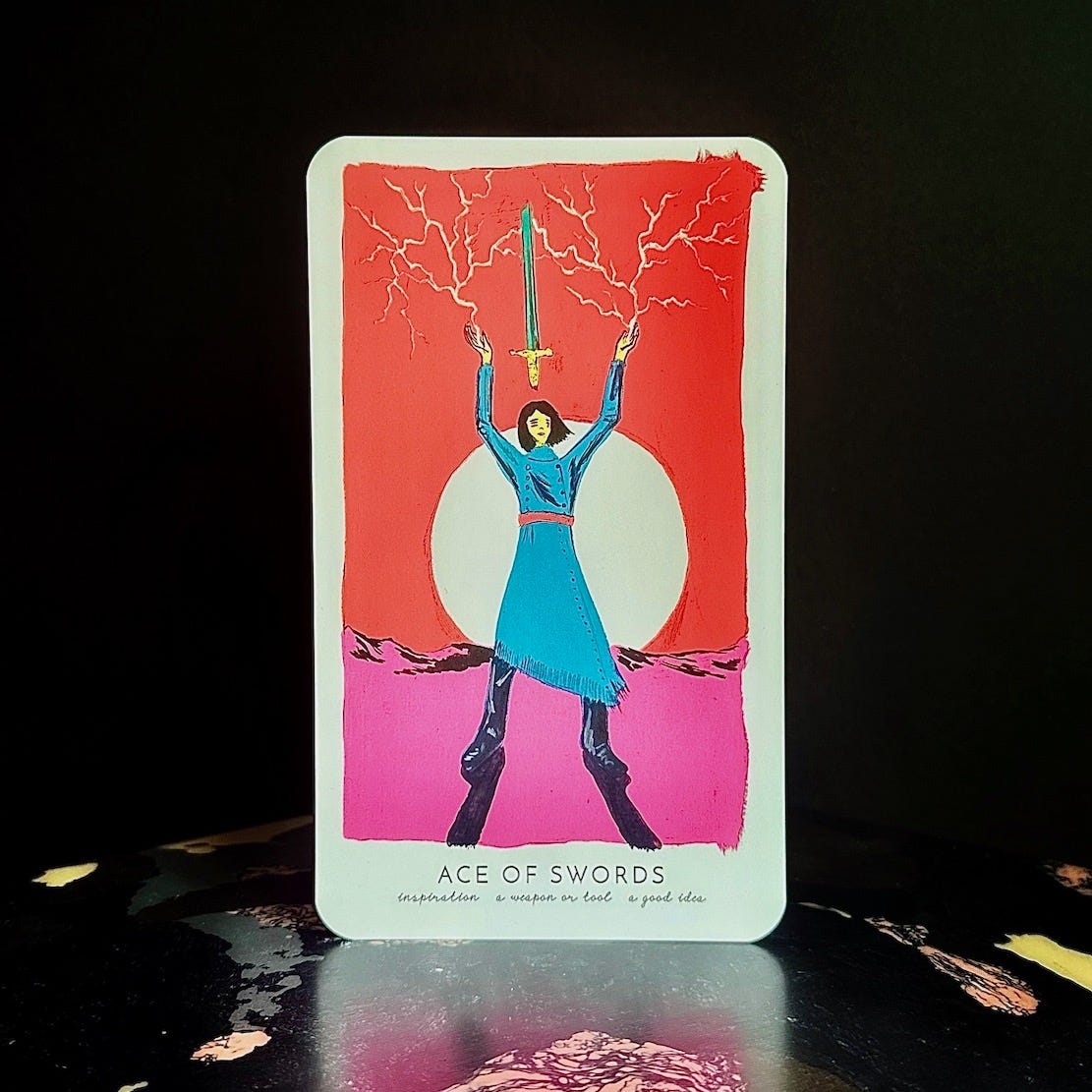 The Ace of Swords is about the power inherent in fresh ideas and new ways of thinking. It could apply to a flash of inspiration, an updated personal philosophy, or the start of a new venture. The Ace reminds us that all we behold—everything that has ever been built—once began with an idea, a seed, an intention.
